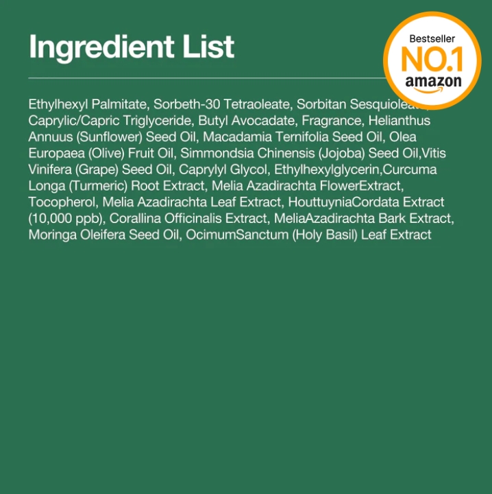 Ethylhexyl Palmitate, Sorbeth-30 Tetraoleate, Sorbitan Sesquioleate, Caprylic/Capric Triglyceride, Butyl Avocadate, Fragrance, Helianthus Annuus (Sunflower) Seed Oil, Macadamia Ternifolia Seed Oil, Olea Europaea (Olive) Fruit Oil, Simmondsia Chinensis (Jojoba) Seed Oil, Vitis Vinifera (Grape) Seed Oil, Caprylyl Glycol, Ethylhexylglycerin, Curcuma Longa (Turmeric) Root Extract, Melia Azadirachta Flower Extract, Tocopherol, Melia Azadirachta Leaf Extract, Houttuynia Cordata Extract, Corallina Officinalis Extract, Melia Azadirachta Bark Extract, Moringa Oleifera Seed Oil, Ocimum Sanctum Leaf Extract.